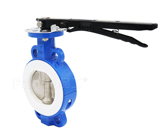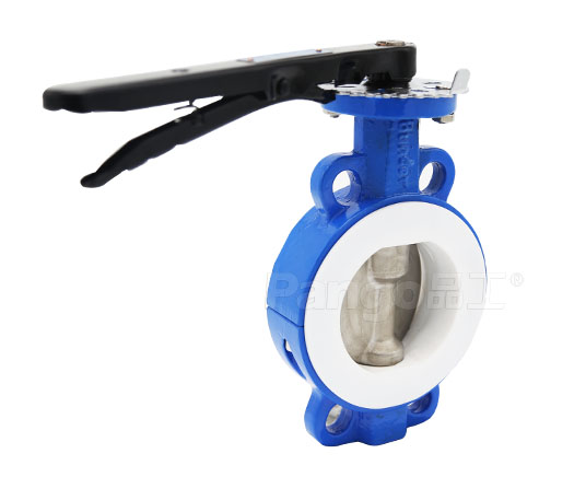 产品配置:对夹连接,WCB体+PTFE, SS304/316板,2Cr13轴,PTFE阀座,铝手柄驱动;