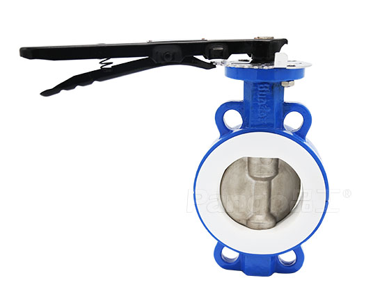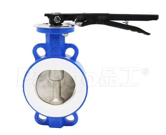 产品配置:对夹连接,WCB体+PTFE, SS304/316板,2Cr13轴,PTFE阀座,铝手柄驱动;